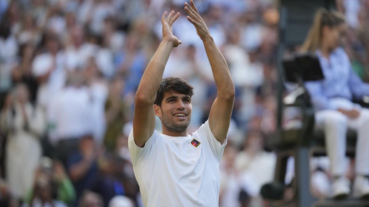 Carlos Alcaraz, de España, famosa después de derrotar a Jan-Lennard Struff de Alemania durante un partido de tercera ronda en el Campeonato de Tenis de Wimbledon en Londres, el viernes 4 de julio de 2025. Crédito de la foto: AP