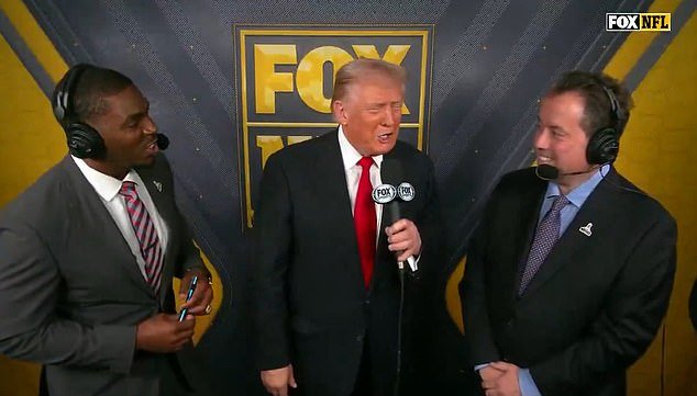 Después de participar en una ceremonia de alistamiento de medio tiempo para nuevos miembros del servicio, Trump fue al stand de Fox Sports para unirse a Vilma y Kenny Albert para hablar sobre fútbol en el tercer cuarto.