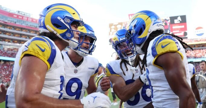 Stafford continuó su juego de nivel MVP, lanzando pases de touchdown a los receptores Puka Nacua y Davante Adams y a los alas cerradas Davis Allen y Colby Parkinson mientras los Rams se vengaban de su derrota en tiempo extra 26-23 ante los 49ers en la Semana 5.