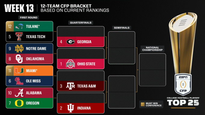 Si los playoffs fueran hoy, serían los enfrentamientos de primera ronda: Tulane en Texas Tech, Miami en Ole Miss, Alabama en Oregon y Notre Dame en Oklahoma. Si bien Miami se encuentra entre los equipos mejor clasificados de la ACC, los Hurricanes tienen una gran oportunidad de ganar el título de la conferencia.