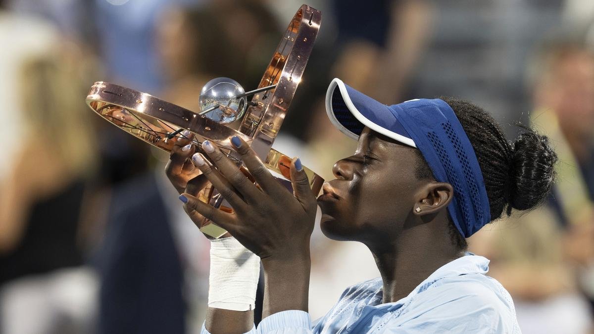 Victoria Mboko de Canadá besa el trofeo después de su victoria contra Naomi Osaka desde Japón en la final del tenis en el National Bank Open en Montreal, jueves 7 de agosto de 2025.