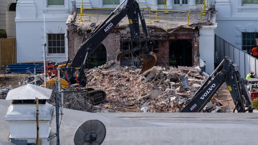 En la foto de arriba: una excavadora trabaja para retirar los escombros después de la demolición del ala este de la Casa Blanca el 23 de octubre de 2025 en Washington, DC.