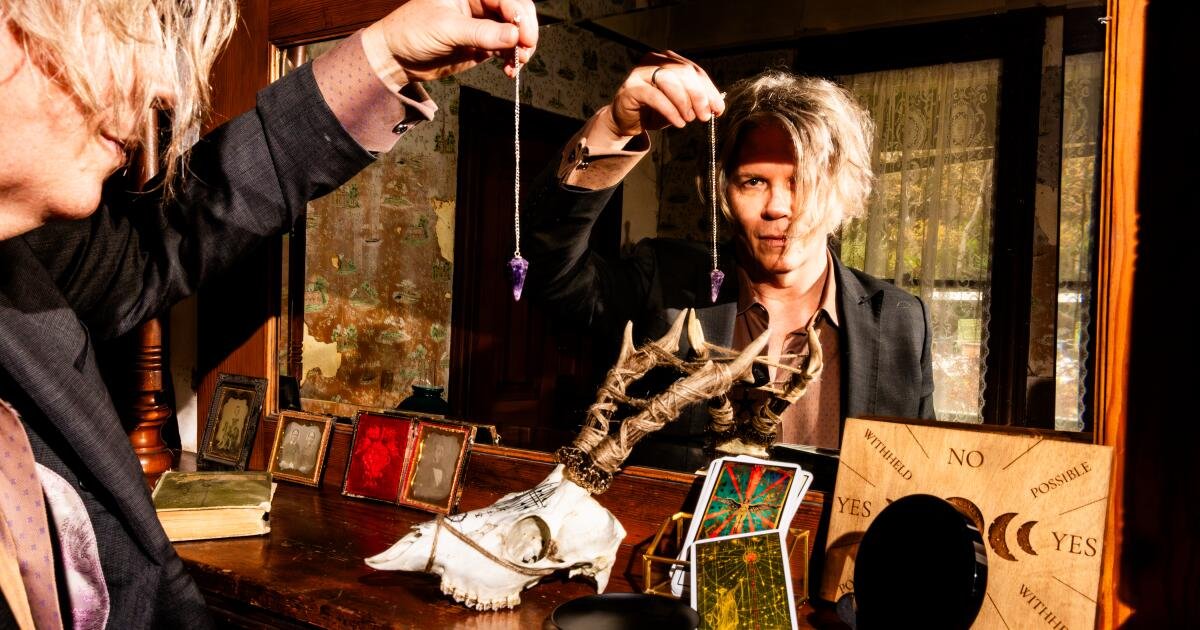 Estoy sentado en una carpa colocada dentro de la sala de estar de una casa de la era victoriana. Frente a mí hay un tablero espiritual, una carta de tarot solitaria y un espejo gritoso negro. Estoy aquí para comunicarse con los muertos.