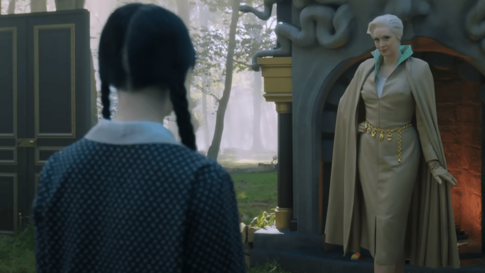 En el trailer el miércoles (Jenna Ortega) se despierta en el coma en el que cayó después de que Tyler (Hunter Doohan) la arrojó por una ventana al Hospital Psiquiátrico de Willow Hill. Weems, vestido como enfermera, el saludo: «¡Levántate y brilla, Sleepyhead! ¿Listo para tu baño de esponja?» De repente, los miércoles y los fines de semana se presentan en una zona de ensueño al aire libre con una puerta que no parece llevar a ningún lado y una estatua en masa de la cabeza de Gorgon con una chimenea en la boca.