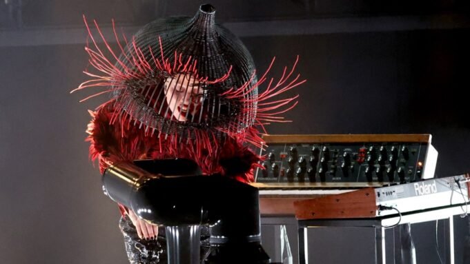 Gaga, flanqueada por una banda que incluía al baterista Josh Freese, pasó gran parte de la actuación detrás de un teclado. Con un traje típico y excéntrico, estaba vestida con plumas de pájaro rojas y su rostro estaba encerrado en un artilugio parecido a una jaula.
