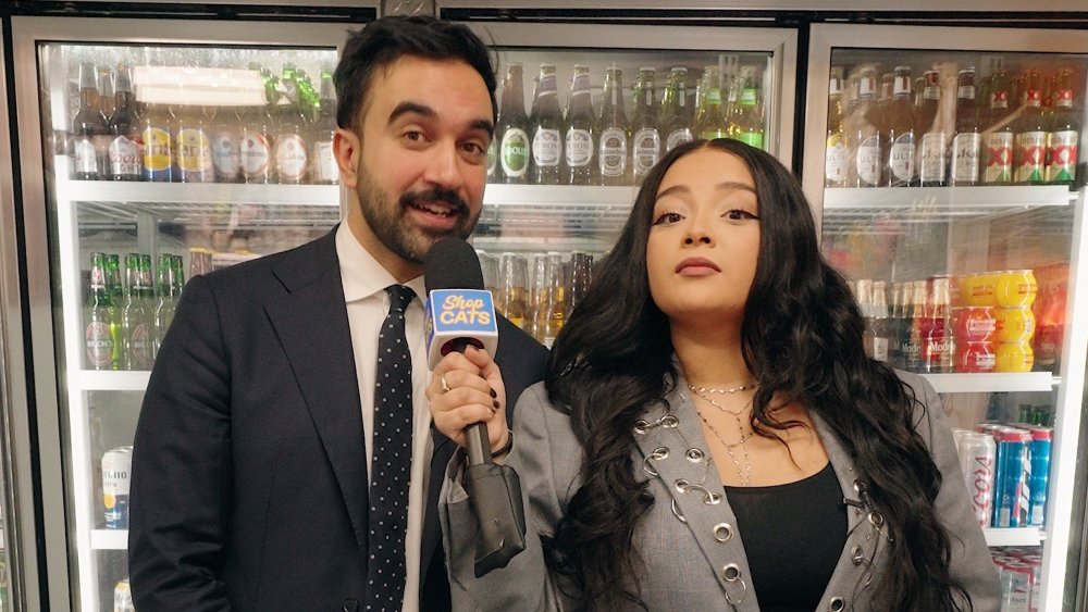 Se ve a Mamdani conociendo al gato residente de la bodega, un gato calicó llamado Coca. «La Coca-Cola es linda», dijo. «Coke quiere jugar. Coca quiere vivir en una ciudad que pueda costear».