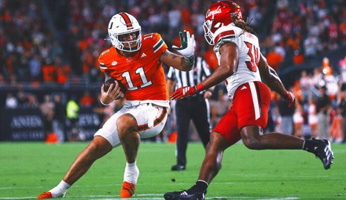 Louisville: Se espera que los Cardinals ingresen al Top 25 de AP el domingo, y Miami estuvo adivinando desde el principio el viernes. La primera práctica incluyó, entre otras cosas, un falso revés y una falsa canasta. La falsificación en el tiro de chip (habría sido de 22 yardas) acercó a los Cardinals a 1, y Moss realizó una jugada más tarde para la anotación inicial del juego.