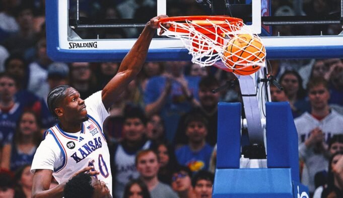 Flory Bidunga completa una fuerte volcada en fuera de juego, ampliando la ventaja de Kansas sobre Utah