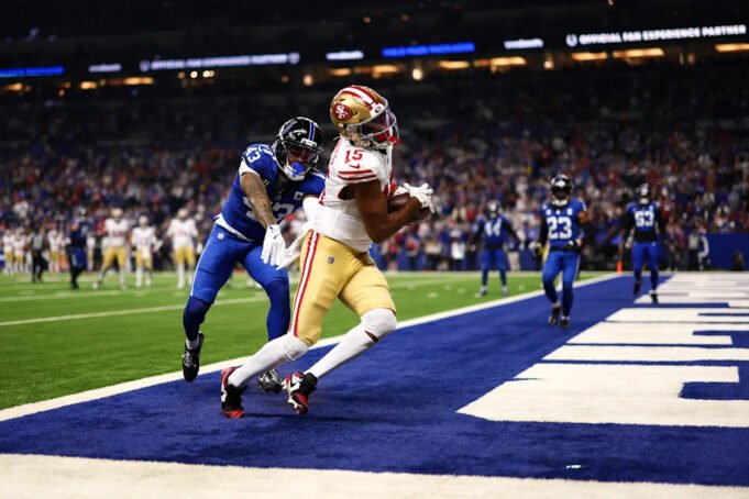 El receptor de los 49ers de San Francisco atrapó un touchdown corto de 3 yardas de Brock Purdy para comenzar la segunda mitad de su victoria 48-27 sobre los Colts de Indianápolis el lunes, e inmediatamente corrió hacia dos fanáticos sentados en la esquina de la zona de anotación. Jennings también extendió la mano con el balón y parecía listo para entregárselo a una mujer sentada en la primera fila.