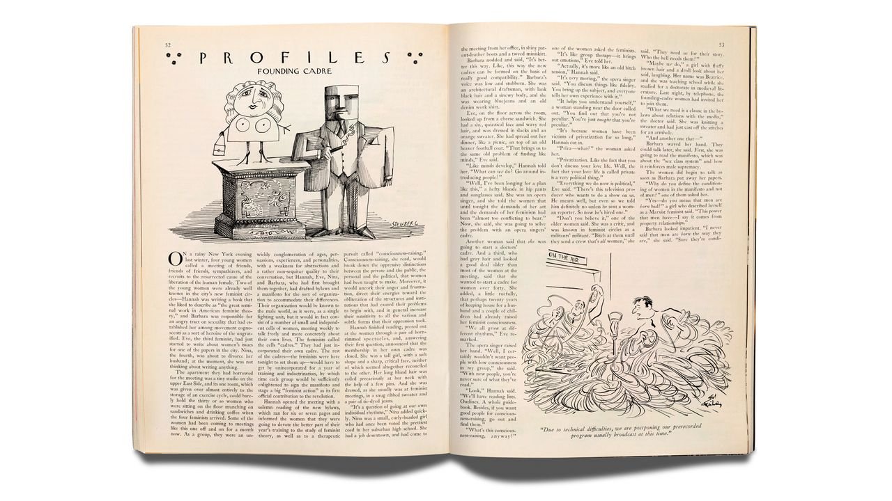 A finales de 1969, Jane Kramer regresó a Manhattan después de una estancia en Marruecos con su marido, un antropólogo. En su ausencia, se encendieron las chispas de la segunda ola feminista, de dos formas: estaban las liberales de AHORA y también los radicales, cuyos coloridos discursos fueron una trampa para los periodistas. Este otoño, el Voz del pueblo Encargó a la escritora Vivian Gornick que criticara a los «libbers», pero en lugar de eso escribió un manifiesto conmovedor que terminaba con la mención de un nuevo grupo y un número al que llamar si quería unirse.