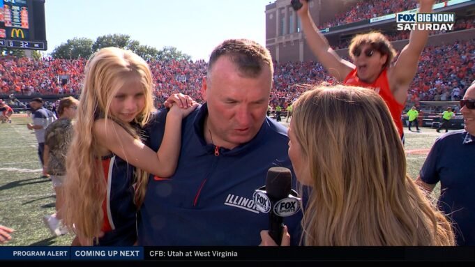 HC Bret Bielema en el número 23 de Illinois luchando contra la victoria de Illini sobre los caballos troyanos de la USC N ° 21.