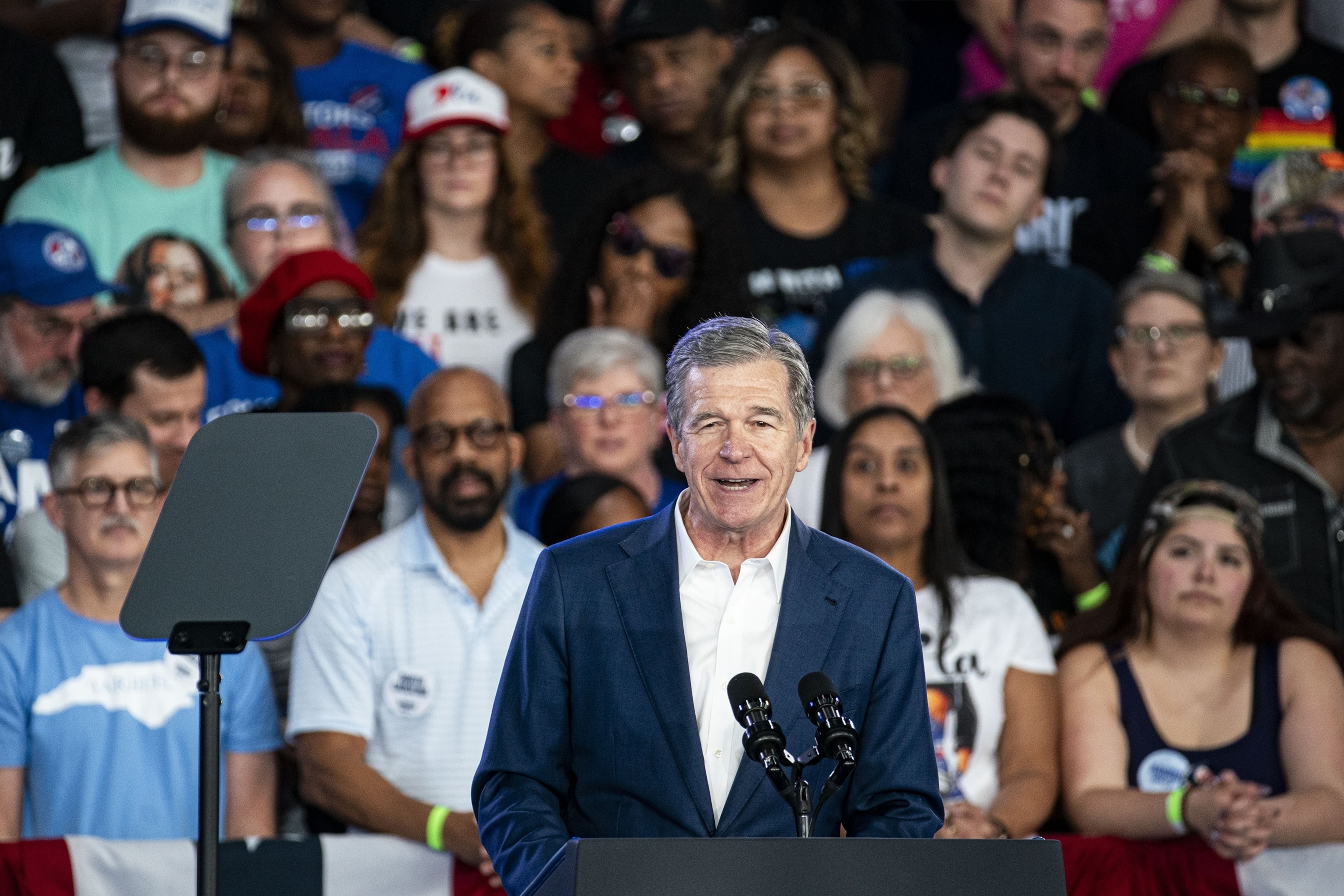 El gobernador de Carolina del Norte, Roy Cooper, habla durante un evento de campaña con la vicepresidenta Kamala Harris en Charlotte, Carolina del Norte, el sábado 2 de noviembre de 2024.
