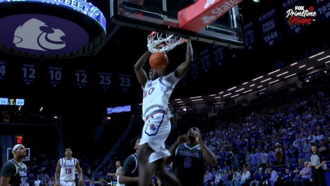 Melvin Council Jr. de los Kansas Jayhawks preparó a Flory Bidunga para el alley-oop contra los Kansas State Wildcats.