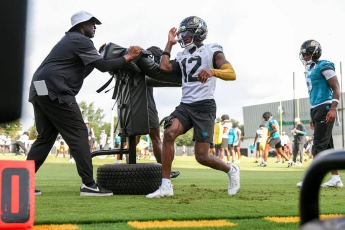 Los Jaguars de Jacksonville permiten que el reclue Travis Hunter entrene a ambos lados del balón del campo de entrenamiento. (Logan Bowles / Getty Images)