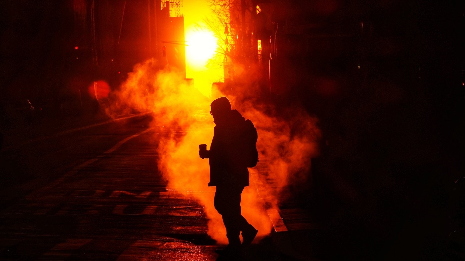 Una persona se prepara para el frío mientras sale el sol por la calle 42 en Nueva York el 20 de enero de 2026.