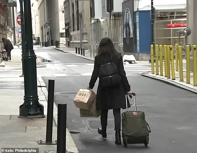 Se ve a una invitada saliendo abruptamente del Hotel Sonder donde se hospedaba en Filadelfia con su equipaje a cuestas.