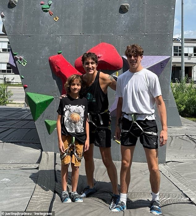 Trudeau abandona el disfraz de un tanque sin mangas mientras posa con los hilos de Xavier y Hadrian en un gimnasio de escalada durante su viaje por carretera canadiense