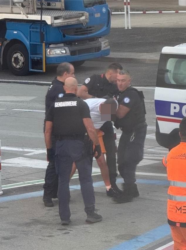 El hombre fuertemente envenenado, con una camiseta blanca y un shorts naranja, todavía estaba tratando de resistir mientras 13 policías franceses lo transportaban a través del fugitivo al aeropuerto de Toulouse