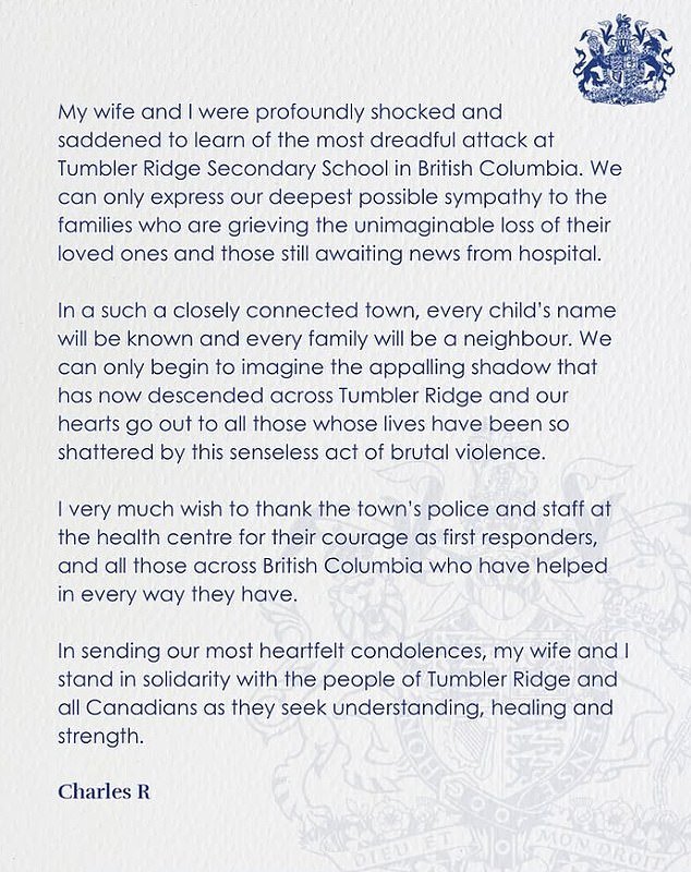 El Rey expresó su profunda “conmoción y tristeza” por el “acto sin sentido de violencia brutal” en la escuela secundaria Tumbler Ridge, uno de los tiroteos masivos más mortíferos en la historia de Canadá.