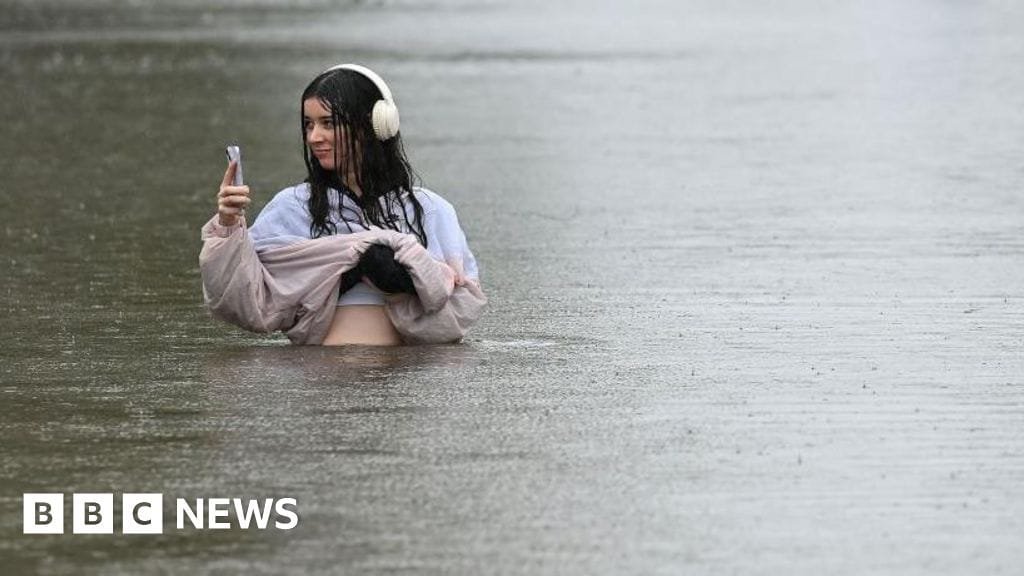 Getty Images son una mujer en marzo en los suburbios de Brisbane se paró en la profundidad de una inundaciónImagen de Getty