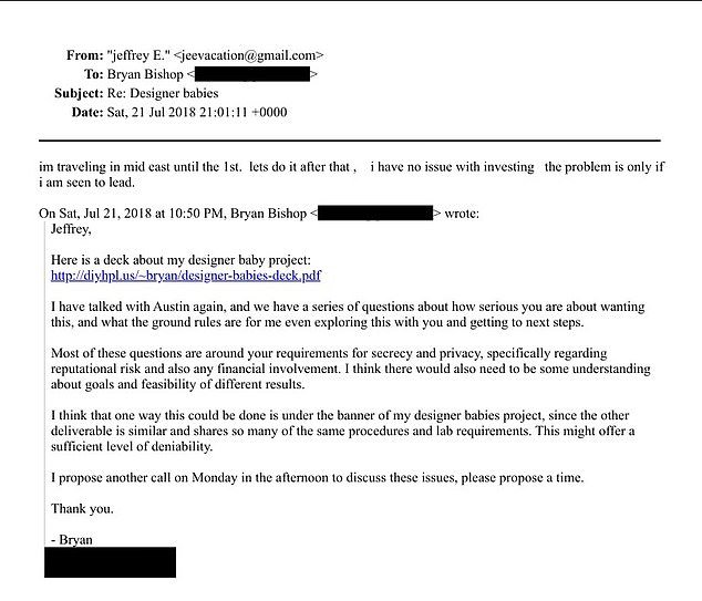 Bryan Bishop se puso en contacto con Jeffery Epstein en 2018 y le propuso una empresa que desarrollaría tecnologías personalizadas para bebés y posiblemente un clon humano.
