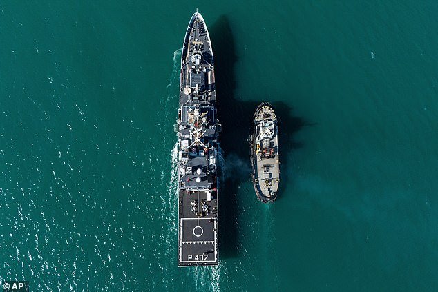 Italia ha propuesto utilizar un “bloqueo naval” para impedir que los barcos de inmigrantes lleguen a sus costas. Foto de archivo: el barco de la marina italiana Libra se acerca al puerto mientras las autoridades italianas transfieren a 40 inmigrantes sin permiso para permanecer en el país a centros de detención de inmigrantes administrados por Italia en Albania, en Shengjin, Albania, el 11 de abril de 2025.