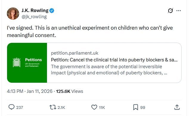JK Rowling ha apoyado una petición que se opone a un ensayo propuesto por el NHS sobre bloqueadores de la pubertad, describiéndolo como «un experimento poco ético con niños que no pueden dar un consentimiento significativo».