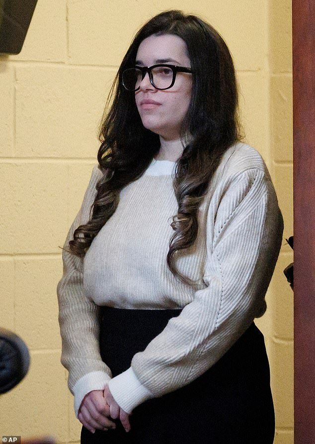 La au pair brasileña también llevaba gafas negras gruesas, pelo largo y negro y parecía no tener maquillaje cuando subió al estrado frente al acusado.