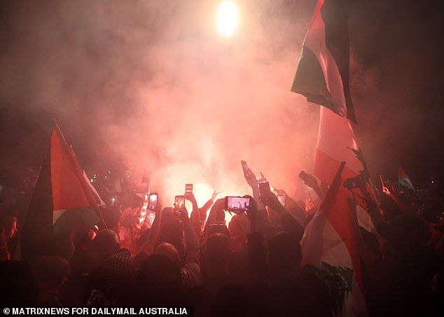 Una demostración en 2023 fuera de la ópera de Sydney vio una bandera israelí quemada e iluminando cohetes