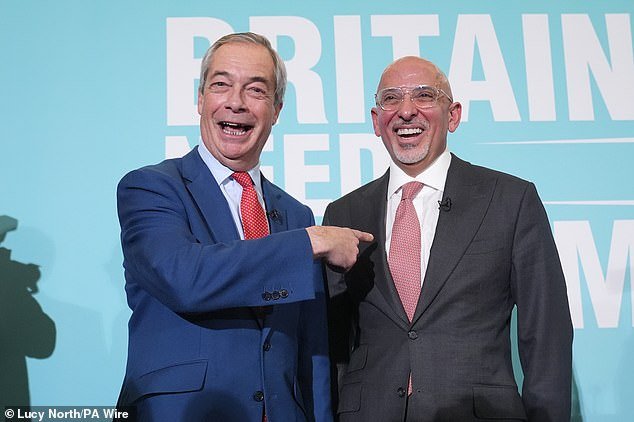 Uno de cada tres estudiantes ahora dice que a Reform UK se le debería prohibir hablar en el campus, según una nueva investigación que sugiere que el «wokery» universitario está empeorando (en la foto: el líder del partido Nigel Farage con el ex canciller conservador Nadhim Zahawi, quien se unió recientemente)
