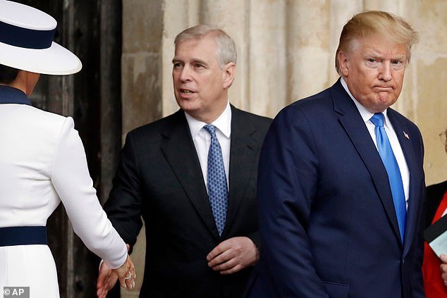 Donald Trump, derecha, y la primera dama Melania Trump, izquierda, acompañados por el príncipe Andrés de Gran Bretaña, salen después de una visita a la Abadía de Westminster en Londres, el 3 de junio de 2019.