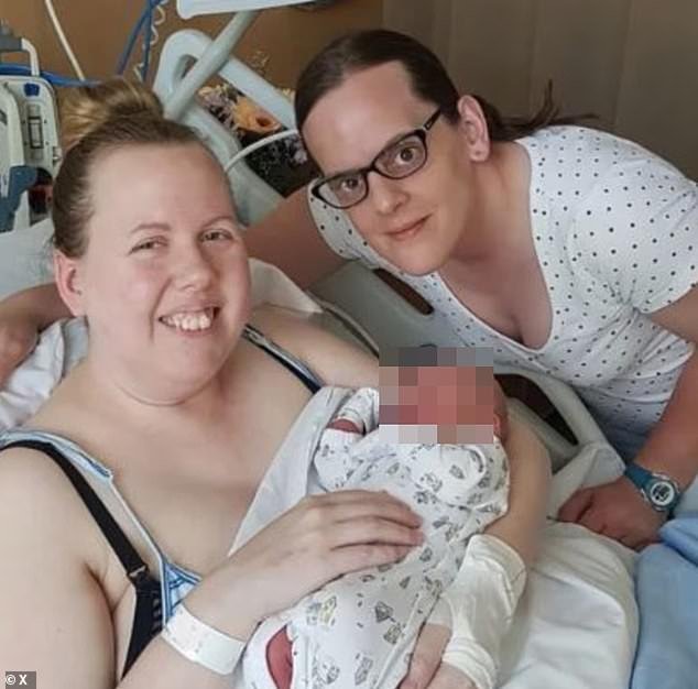 La mujer transgénero Jennifer Buckley (derecha) aparece en la foto con su hijo recién nacido y su esposa, Sandi. Buckley demanda a ex consultora de lactancia materna por «discriminación» y «difamación»