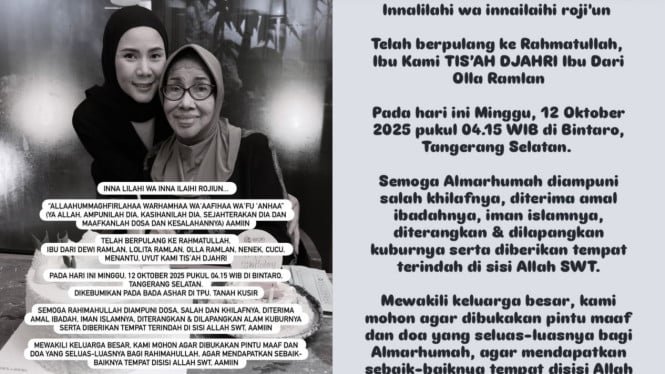 «Innalilahi wa innailaihi roji’un. Falleció en Rahmatullah, Nuestra Madre TIS’AH DJAHRI Madre de Olla Ramlan. Hoy es domingo 12 de octubre de 2025 a las 04:15 WIB en Bintaro, Tangerang del Sur», se lee en el mensaje de la familia de Olla Ramlan, citado por VIVA, el domingo 12 de octubre de 2025.