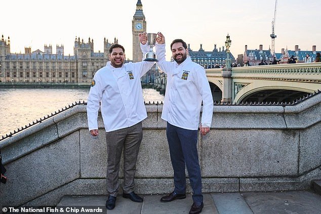 Aman, de 36 años, y Gavin, de 33, ganaron la 38ª edición del concurso oficial de pescado y patatas fritas del Reino Unido.
