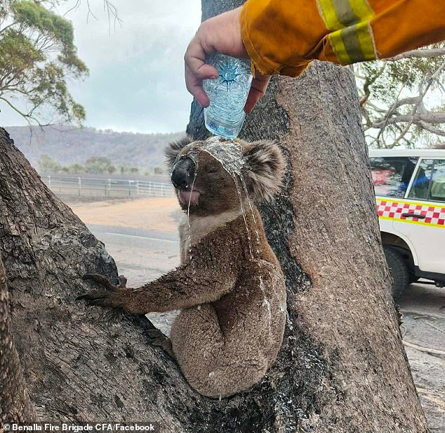 Ha surgido una imagen desgarradora de un bombero echando agua a un koala para mantenerlo fresco mientras una intensa ola de calor e incendios forestales asolan Victoria.